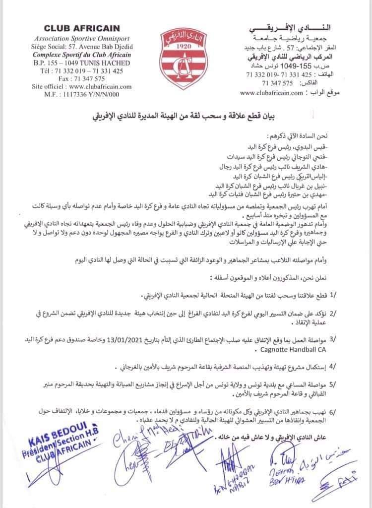 النادي الإفريقي : فرع كرة اليد يصدر بيان قطع ثقة.