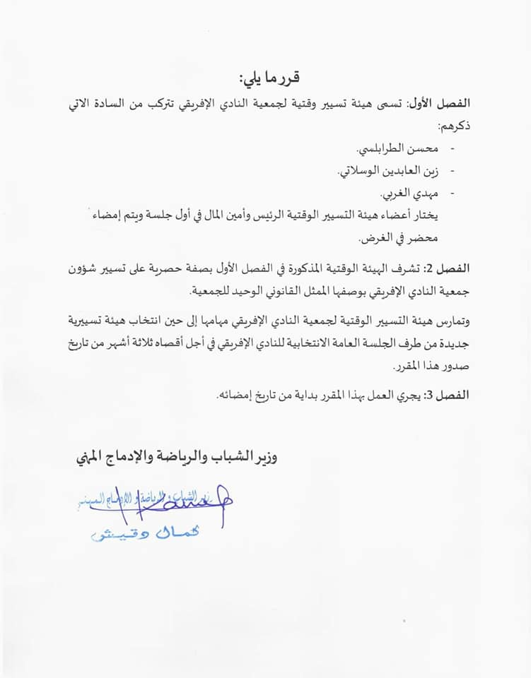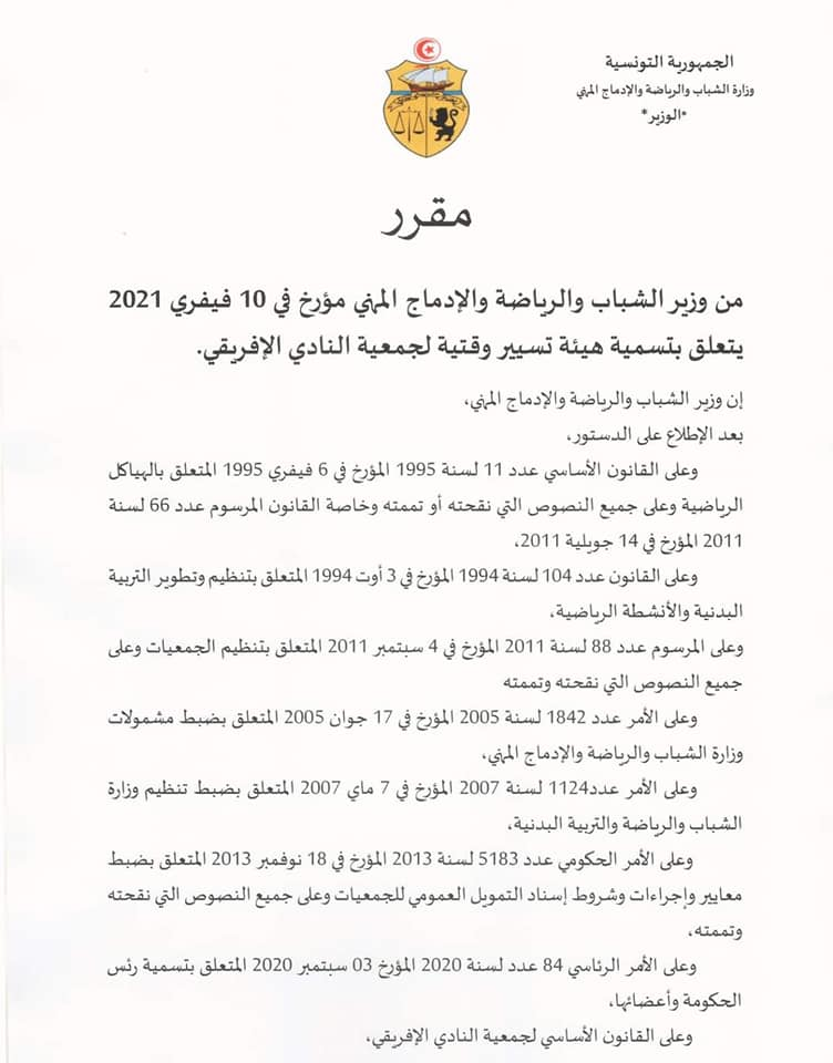 يأتي هذا القرار بعد أن تم تكليف لجنة صلب الوزارة لمعاينة حالة الشغور في الهيئة المديرة للنادي الإفريقي.